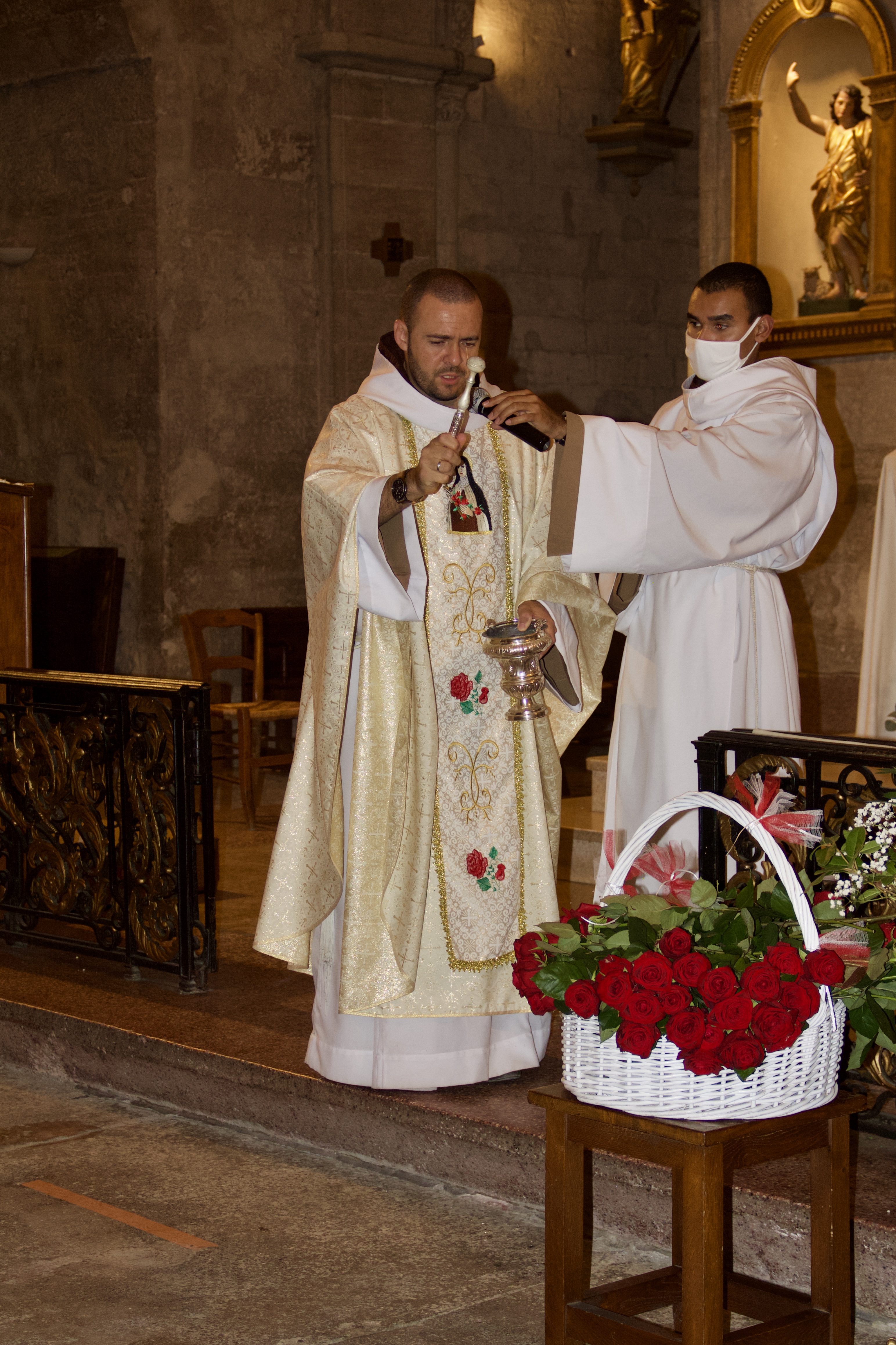 Le Père César et le Père Saulo de Tarso ont célébré la messe solennelle en la fête de Ste Thérèse de Lisieux qui vient clôturer la neuvaine. Avant l’envoi les roses ont été bénies et remises aux fidèles présents, comme le signe de la pluie de bénédictions du Seigneur sur chacun de ses enfants.